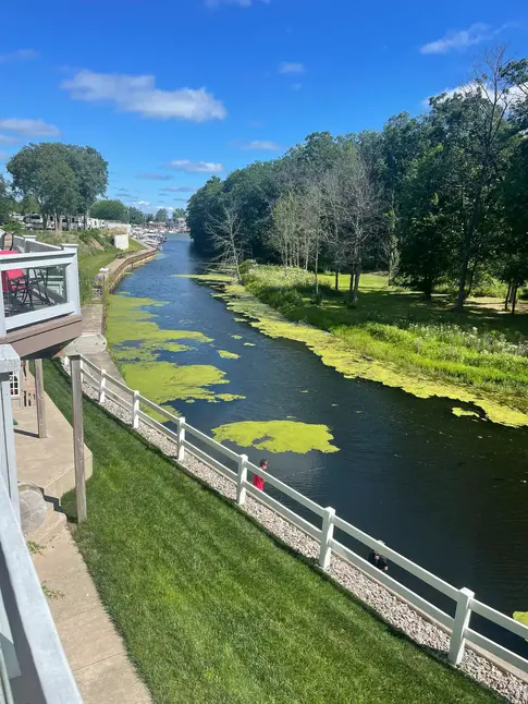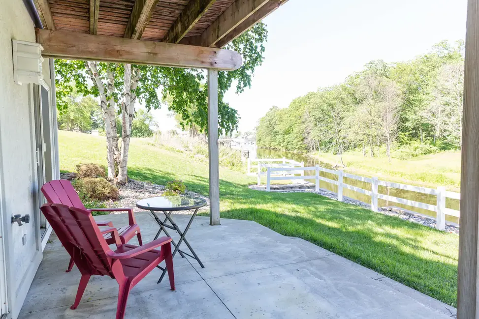 Fully functional kitchen and dining area. Patio seating w/ gas grill on a balcony overlooking the Pigeon River.